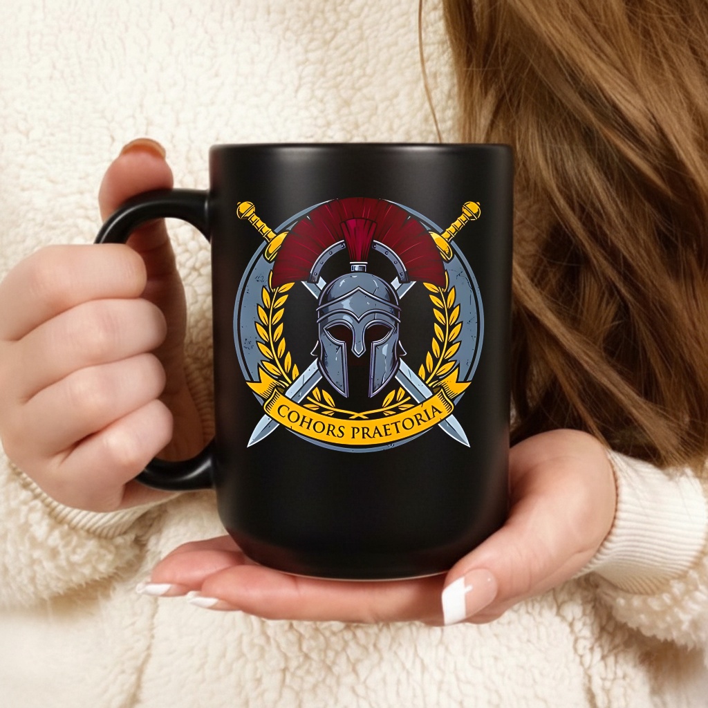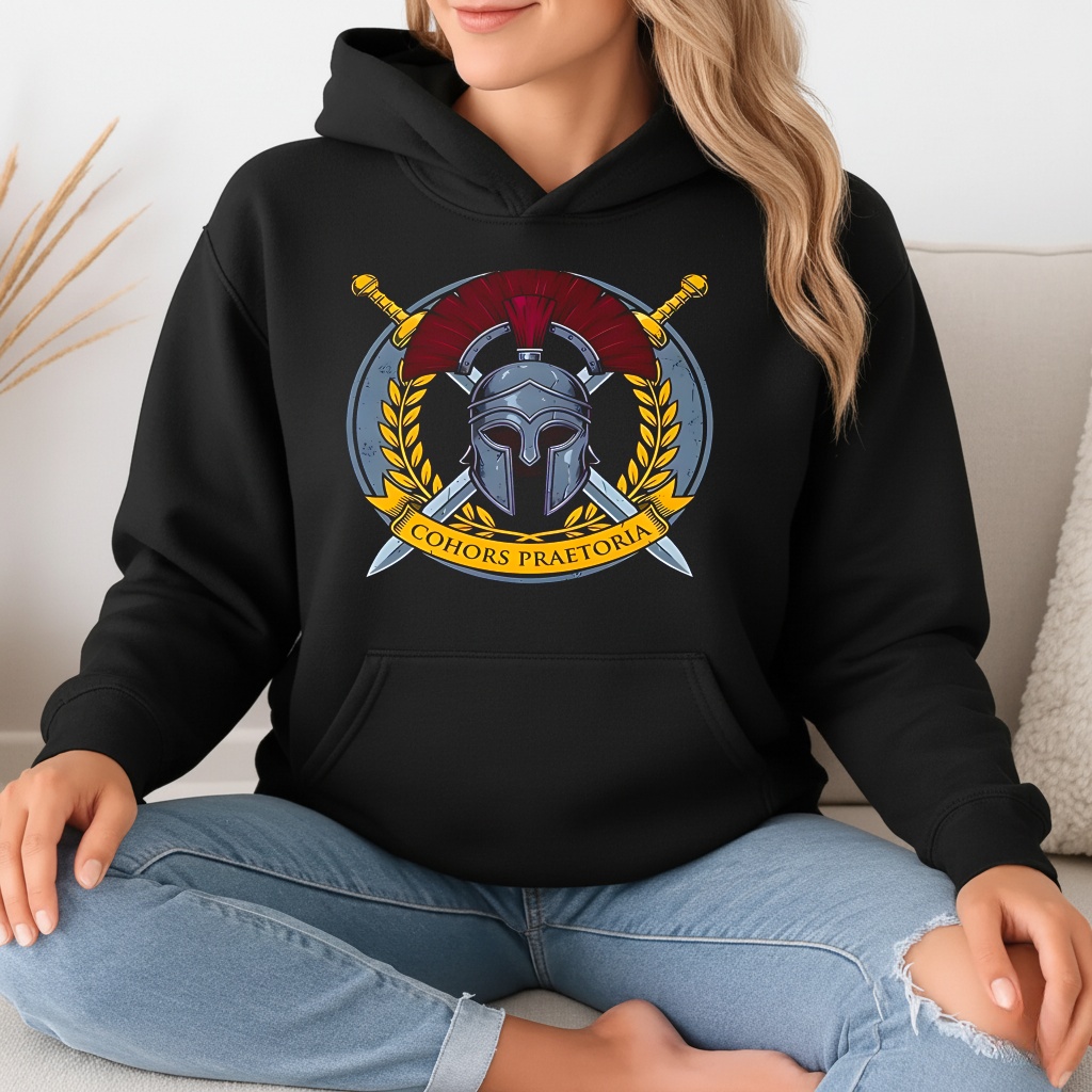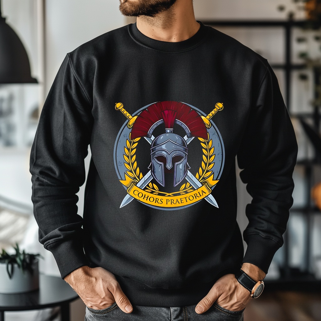 What do the symbols represent? The helmet (galea) and crossed swords (gladii) on this Praetorian Guard shirt are the classic symbols of the Roman legions, specifically representing the combat readiness of the Emperor’s guard.